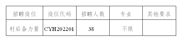 因工作需要,經(jīng)研究,現(xiàn)面向社會公開招聘陳瑤湖鎮(zhèn)38名村級后備力量,現(xiàn)將有關(guān)事項公告如下: