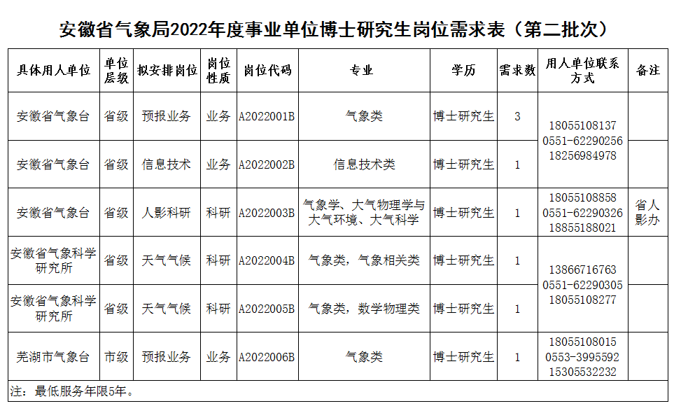 此次招聘崗位為博士崗位。具體單位、崗位、專業(yè)、學歷要求等詳見《安徽省氣象局2022年度事業(yè)單位博士研究生崗位需求表》。