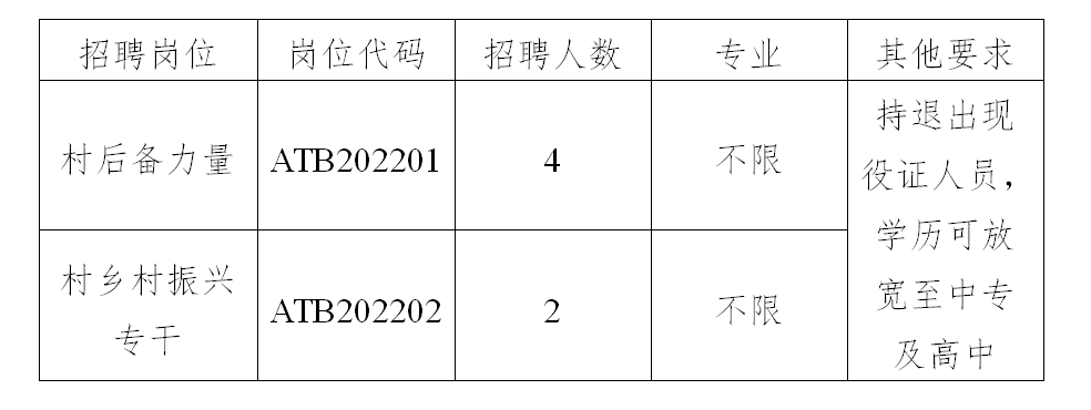 因工作需要,經(jīng)研究,現(xiàn)面向社會(huì)公開招聘4名村級(jí)后備力量和2名鄉(xiāng)村振興專干,現(xiàn)將有關(guān)事項(xiàng)公告如下: