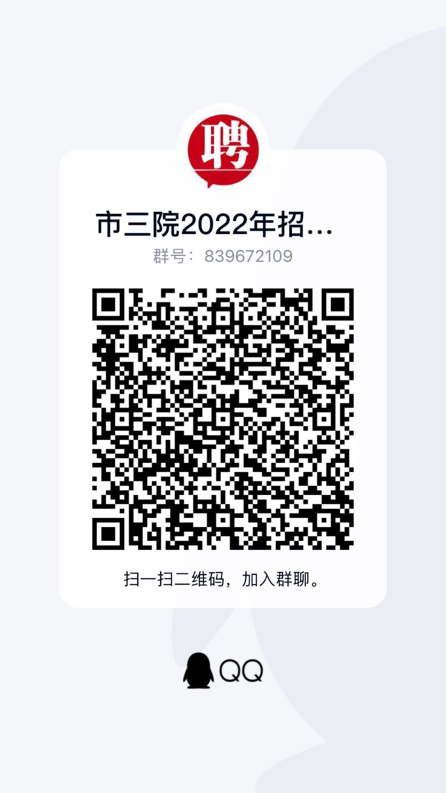 因疫情影響,報名采取網(wǎng)上報名方式。報名人員可通過銅陵市第三人民醫(yī)院網(wǎng)站(網(wǎng)址:http://www.tl-sy.com/)或掃碼進(jìn)群查看招聘信息,下載招聘人員報名表,填寫完畢后發(fā)送至電子郵箱635423407@qq.com,同時附身份證、畢業(yè)證書、學(xué)位證書、執(zhí)業(yè)資格證書、學(xué)校就業(yè)推薦表等掃描件。