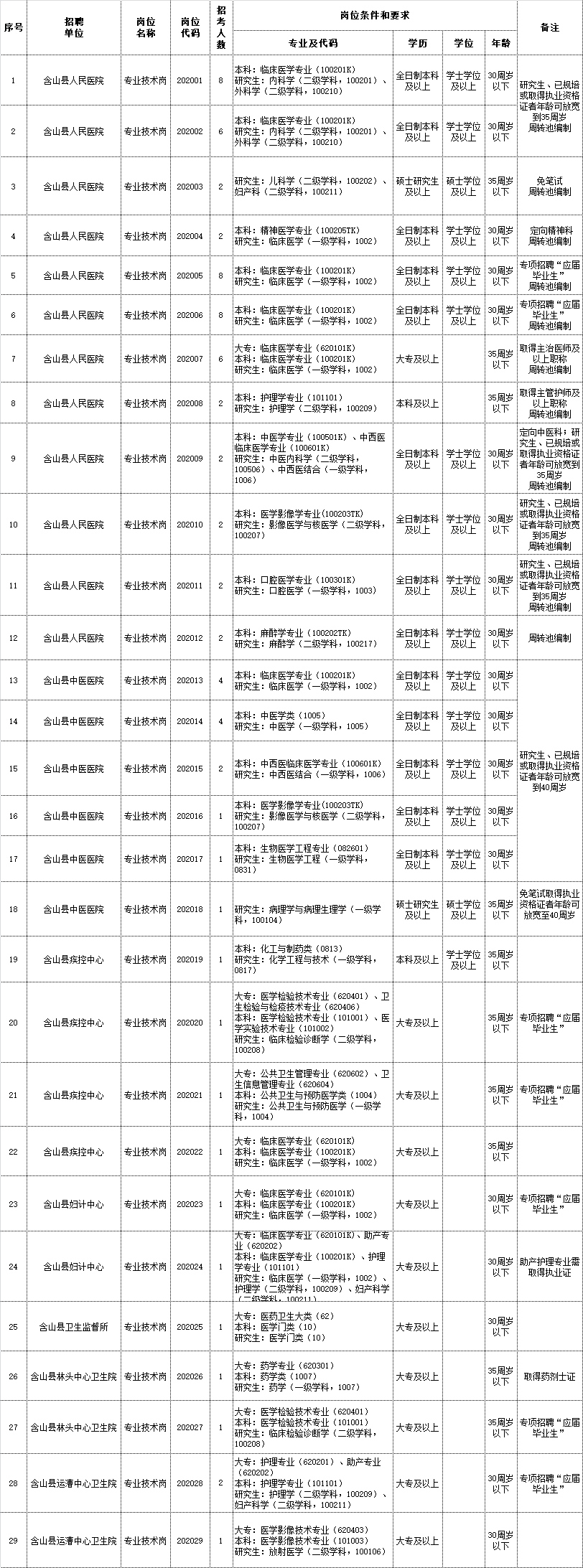 附件:2020年含山縣醫(yī)療衛(wèi)生事業(yè)單位公開招聘工作人員職位表