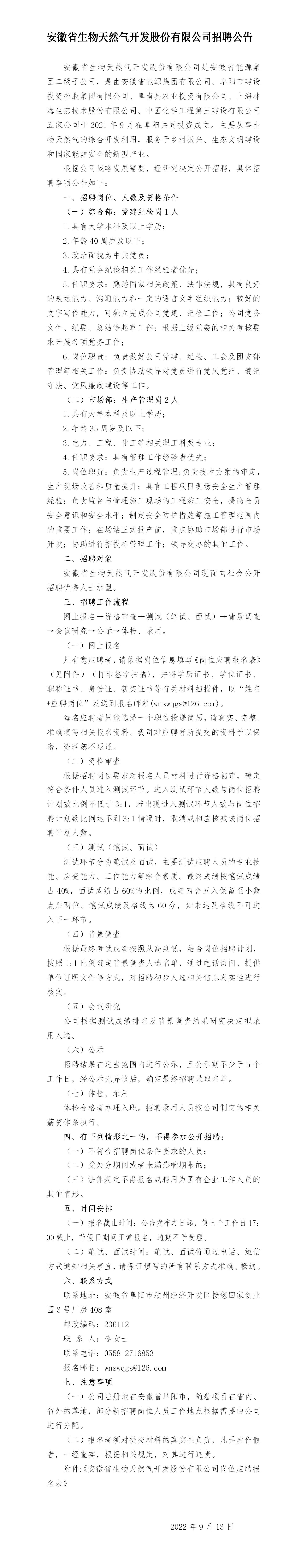 2022年阜陽安徽省生物天然氣開發(fā)股份有限公司招聘公告