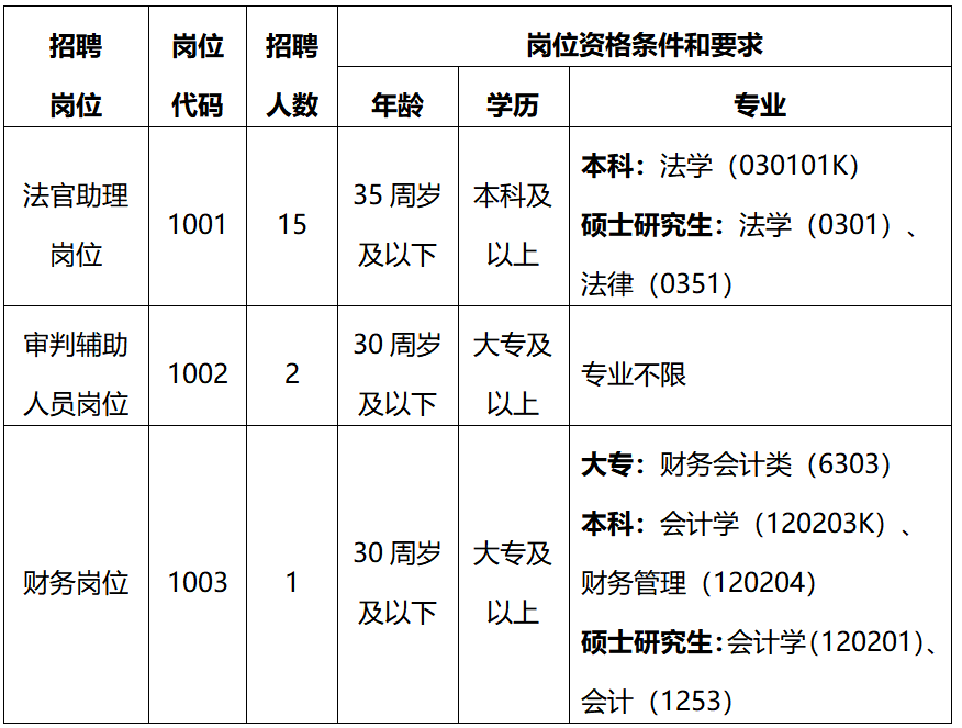 2.根據(jù)審判工作專業(yè)化需要,審判輔助人員崗位(1002崗)法律專業(yè)大專學(xué)歷(法律實(shí)務(wù)類專業(yè)代碼:6805)的在筆試成績基礎(chǔ)上加2分,法律專業(yè)本科及以上學(xué)歷(本科法學(xué)專業(yè)代碼:030101K、研究生法學(xué)專業(yè)代碼:0301、0351)的在筆試成績基礎(chǔ)上加3分,學(xué)歷加分不累加。