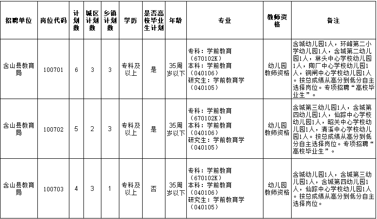 2020年度含山縣幼兒教師公開招聘計劃中另安排部分崗位,用于專項招聘“高校畢業(yè)生”,包括以下人員: