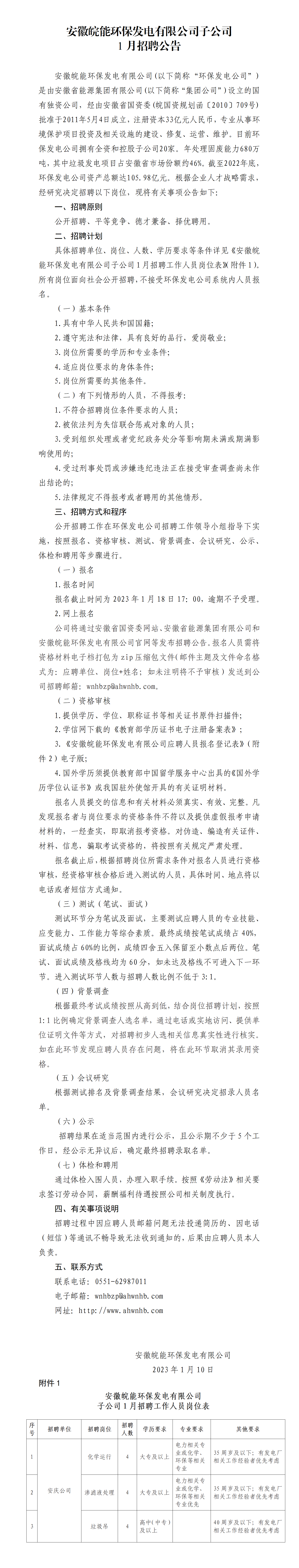 具體招聘單位、崗位、人數(shù)、學(xué)歷要求等條件詳見《安徽皖能環(huán)保發(fā)電有限公司子公司1月招聘工作人員崗位表》附件1)。所有崗位面向社會公開招聘,不接受環(huán)保發(fā)電公司系統(tǒng)內(nèi)人員報名。