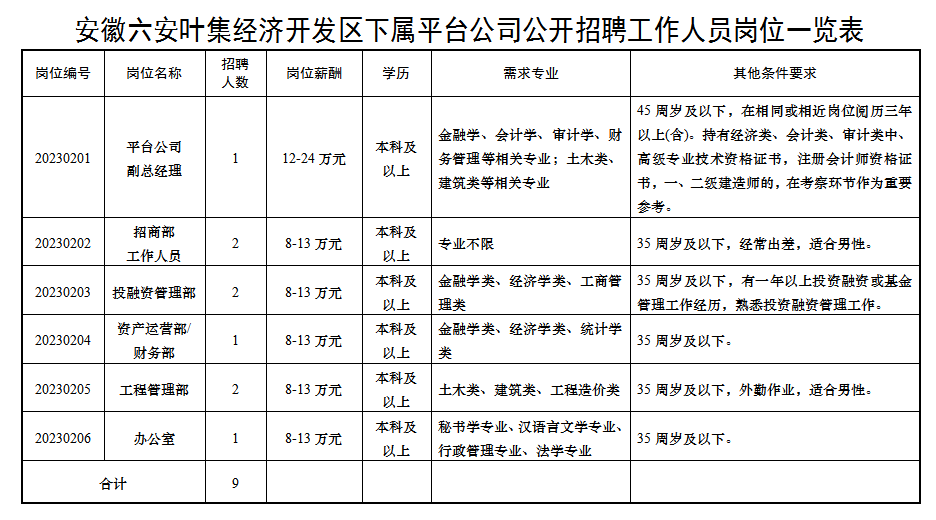 根據(jù)工作需要,安徽六安葉集經(jīng)濟開發(fā)區(qū)下屬平臺公司(國有企業(yè))現(xiàn)擬面向社會公開招聘9名工作人員,現(xiàn)就有關(guān)事項公告如下: