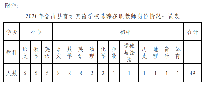 2020-07-31 18:10:57閱讀()含山縣人民政府為加強民辦學校教師隊伍建設,提高含山縣育才實驗學校代培的義務教育階段學生的教學質量,根據(jù)含山縣人民政府2020年6月24日專題會議紀要(第23號)精神,決定面向全縣農村中小學在編在職教師公開選聘中小學教師到含山縣育才實驗學校任教,現(xiàn)將選調有關事項公告如下: