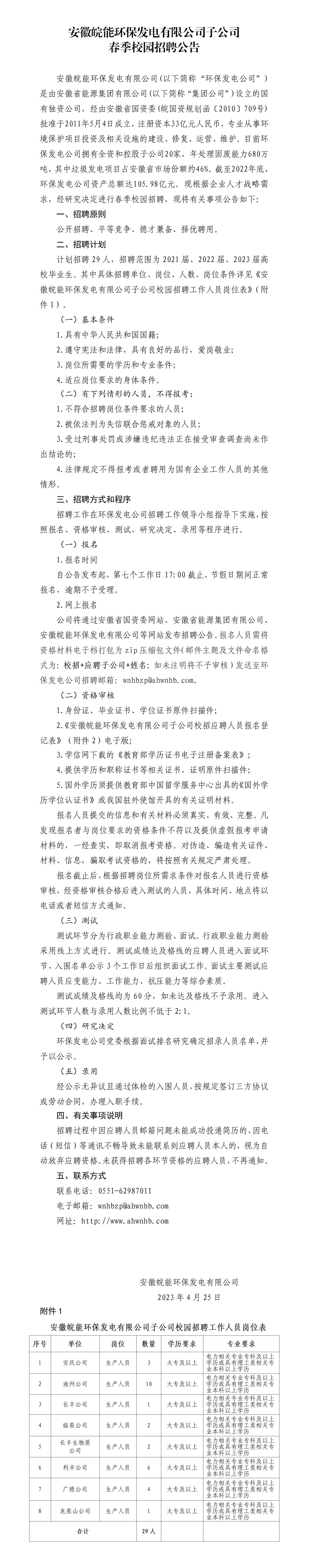 計(jì)劃招聘29人,招聘范圍為2021屆、2022屆、2023屆高校畢業(yè)生。其中具體招聘單位、崗位、人數(shù)、崗位條件詳見《安徽皖能環(huán)保發(fā)電有限公司子公司校園招聘工作人員崗位表》(附件1)。