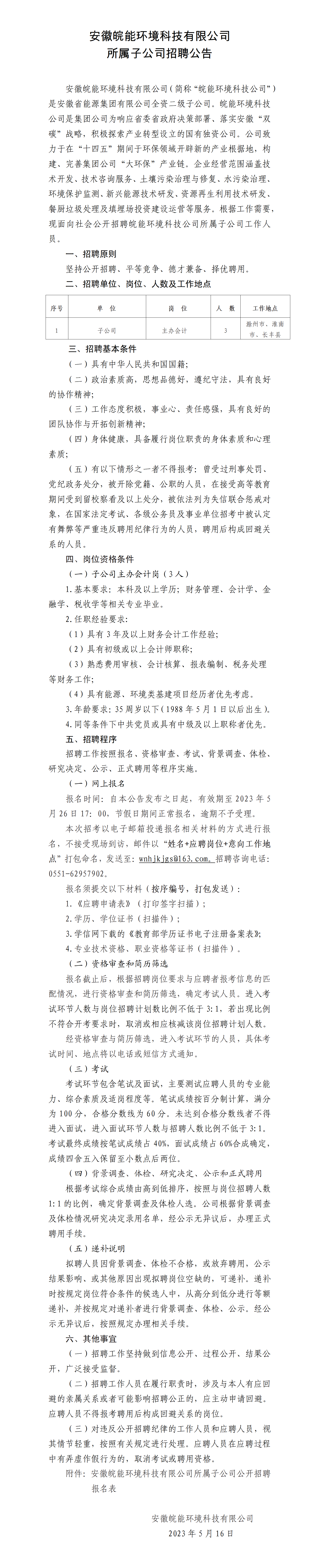 2023年安徽皖能環(huán)境科技有限公司所屬子公司招聘公告