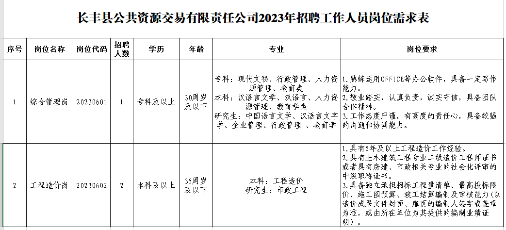 附件1:長豐縣公共資源交易有限責(zé)任公司2023年招聘工作人員崗位需求表