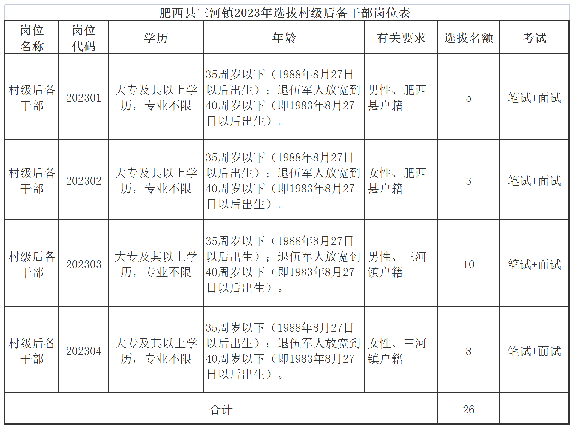 計(jì)劃選拔26名村級(jí)后備干部,其中肥西縣戶(hù)籍8名,三河鎮(zhèn)戶(hù)籍18名。詳見(jiàn)附表。