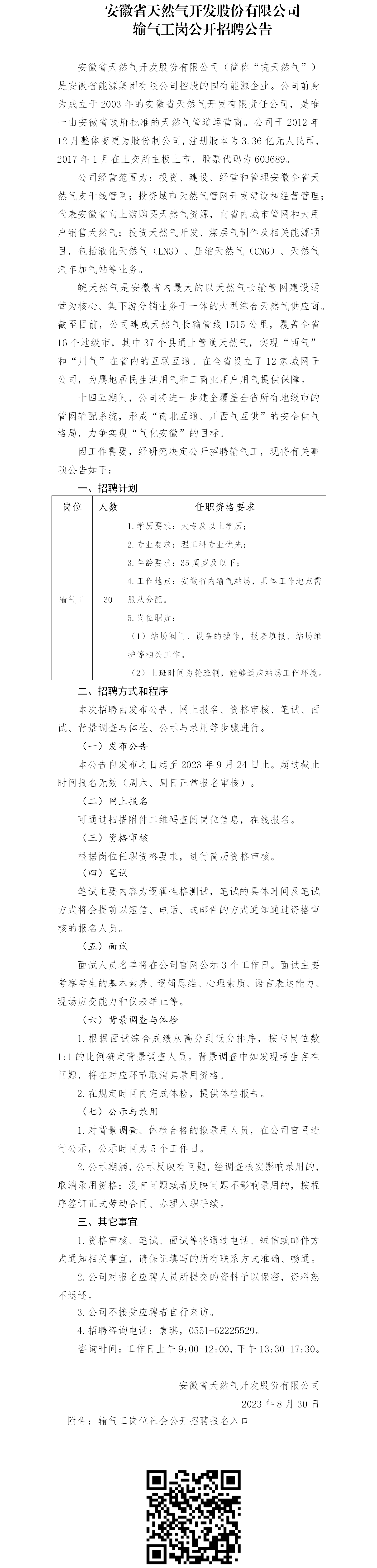 2023年安徽省天然氣開發(fā)股份有限公司輸氣工崗公開招聘公告
