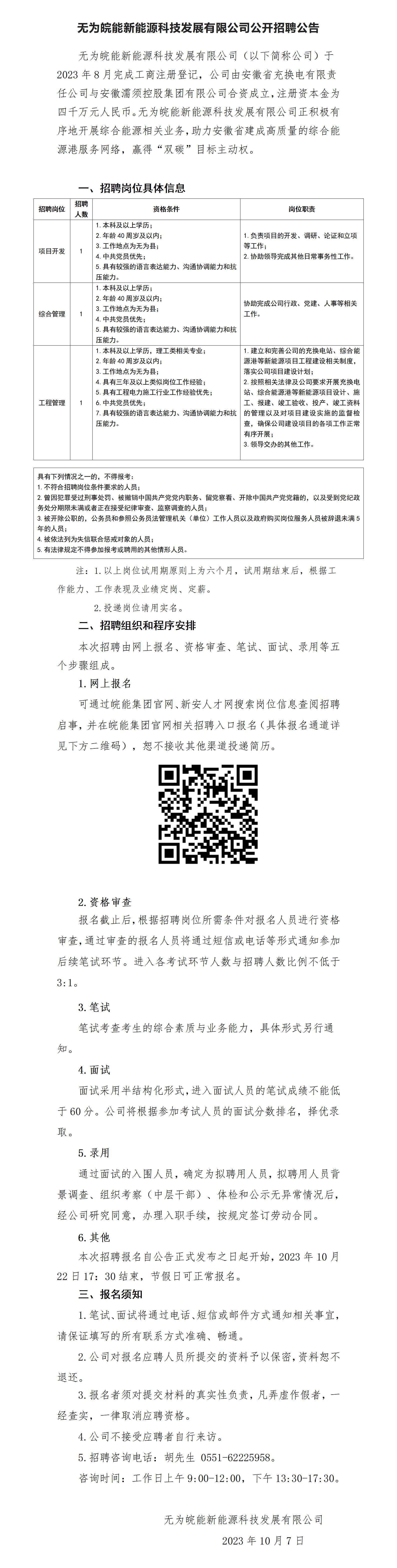 2023年蕪湖無(wú)為皖能新能源科技發(fā)展有限公司公開招聘公告