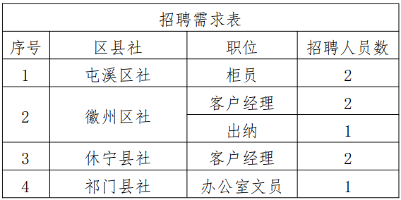 二、 招聘崗位及工作地點:柜員2人、客戶經(jīng)理4人、出納1人、辦公室文員1人(具體見下表),黃山市范圍內(nèi),遵循屬地原則。