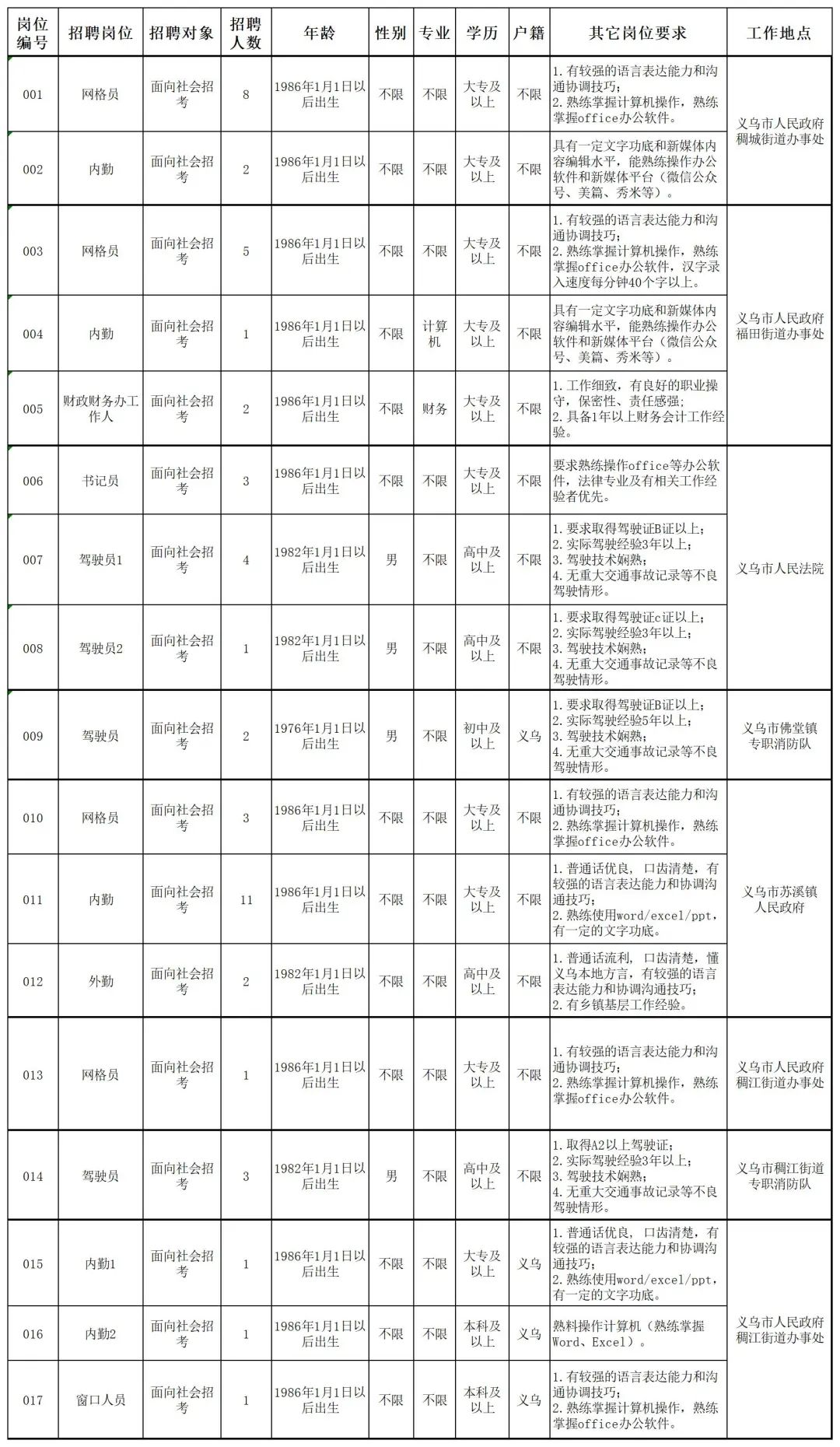 (一)本次計劃招聘51名工作人員。招聘崗位、招聘人數(shù)及具體要求詳見詳見《義烏市機關(guān)事業(yè)單位編外聘用人員招聘計劃(三)》。